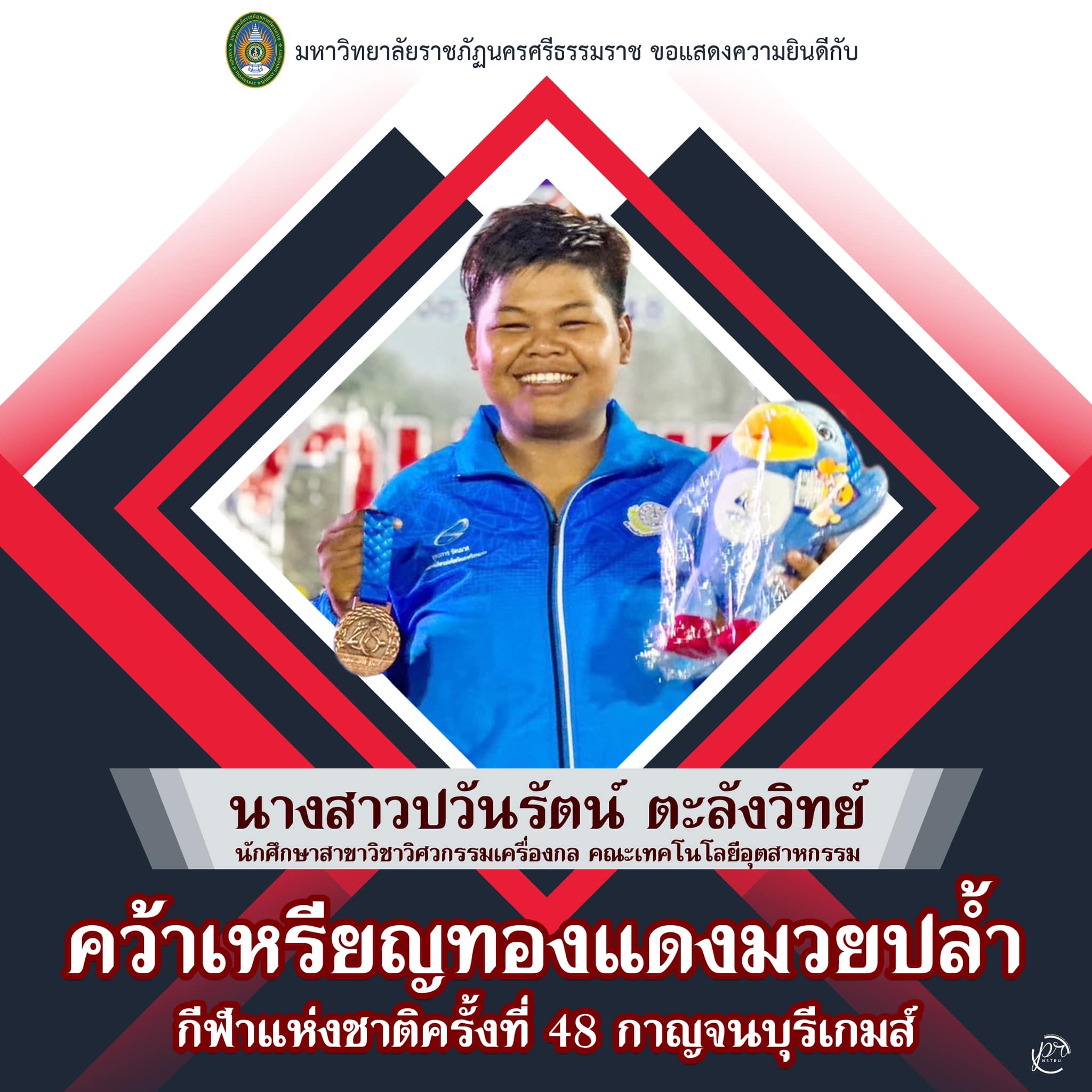 #ขอแสดงความยินดี กับ นางสาวปวันรัตน์ ตะลังวิทย์ นักศึกษาสาขาวิศวกรรมเครื่องกล คว้าเหรียญทองแดงมวยปล้ำ กีฬาแห่งชาติครั้งที่ 48 กาญจนบุรีเกมส์