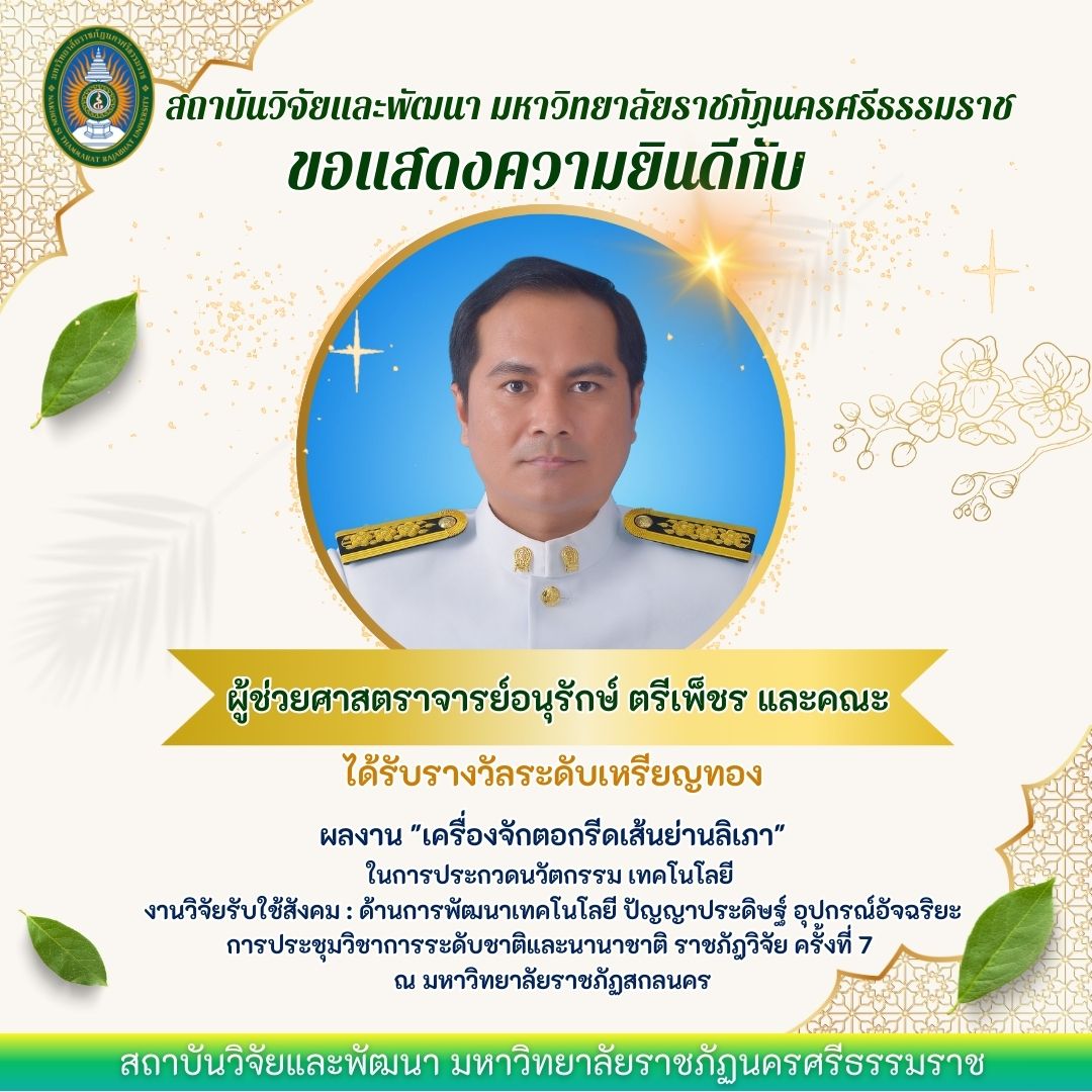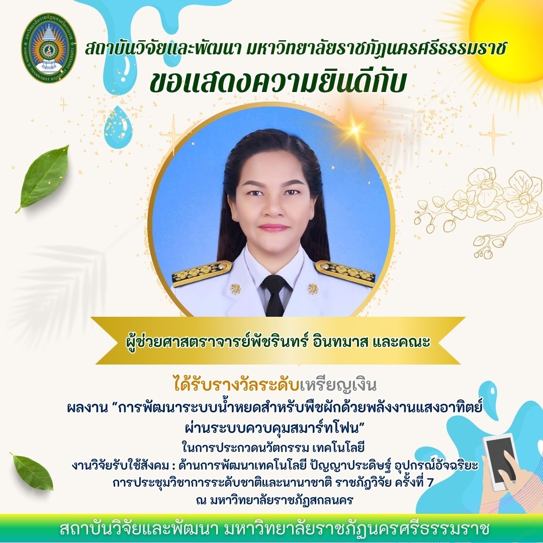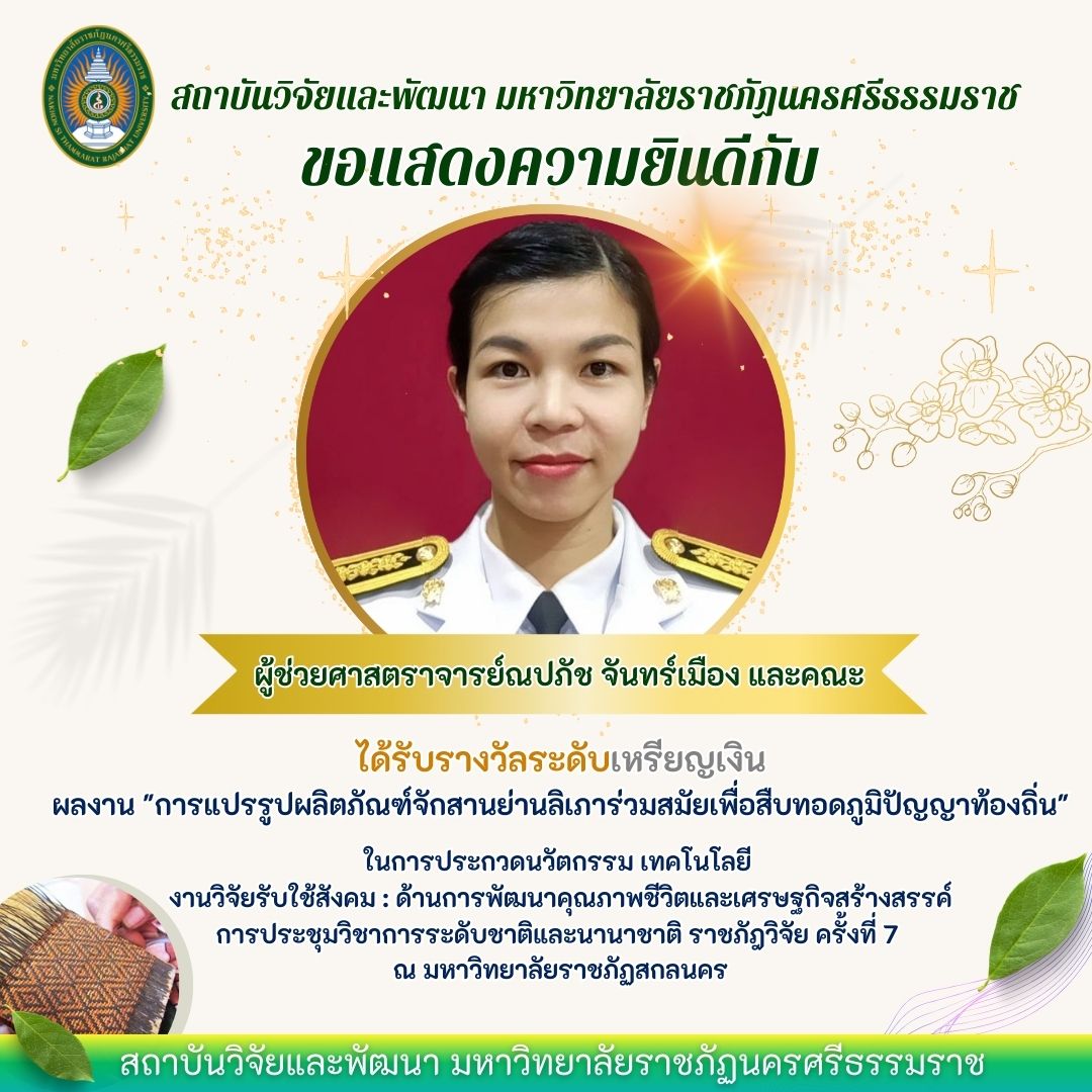 ขอแสดงความยินดีกับนักวิจัยที่ได้รับรางวัล ในงานประชุมวิชาการระดับชาติและนานาชาติ ราชภัฏวิจัยครั้งที่ 7 ระหว่างวันที่ 14-16 พฤศจิกายน 2566 ณ มหาวิทยาลัยราชภัฏสกลนคร