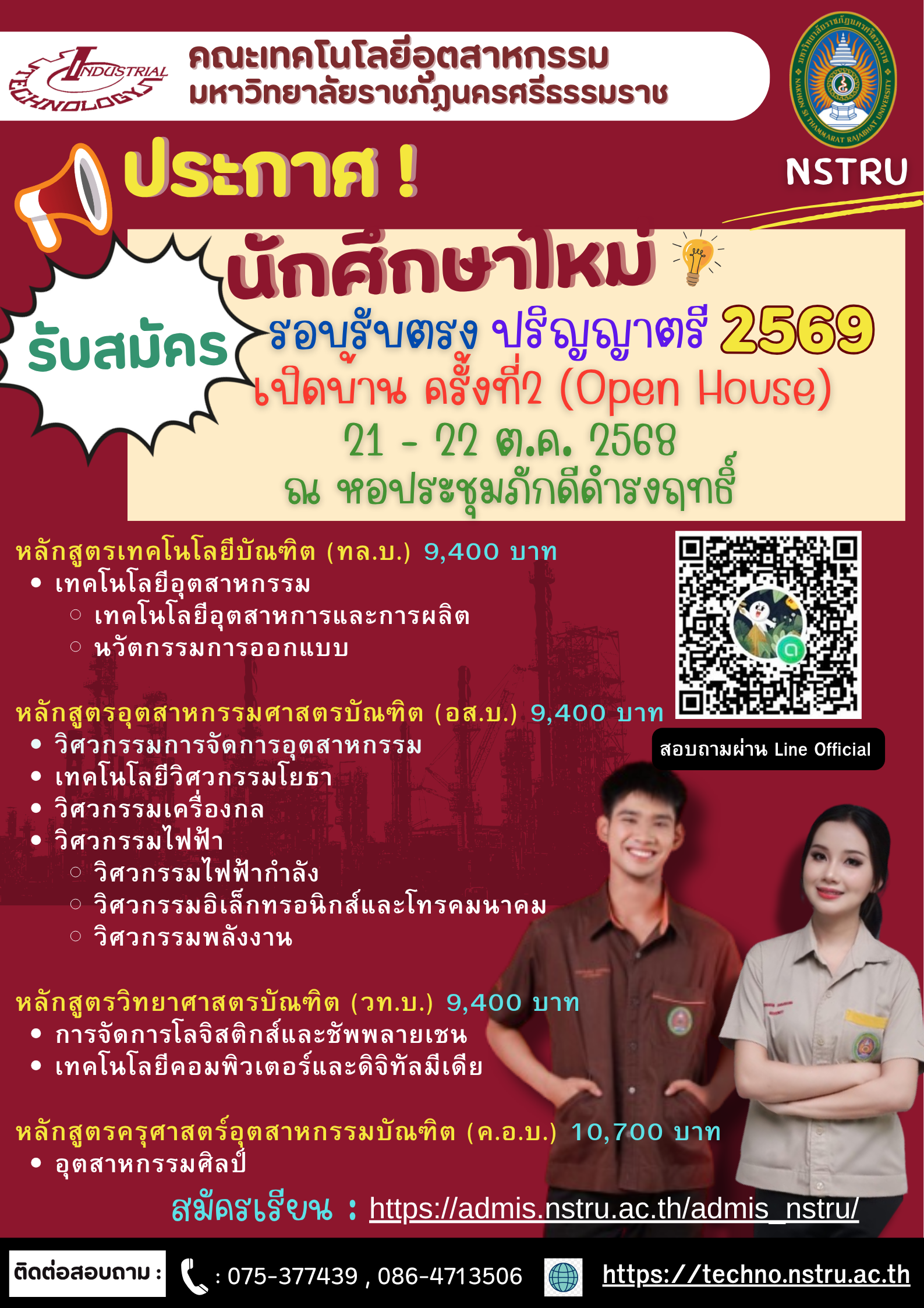 เปิดสมัครนักศึกษา ปริญญาตรี ภาคปกติ ม.ราชภัฏนครศรีธรรมราช ปีการศึกษา 2569 OPEN HOUSE ครั้งที่ 2 2569 วันที่ 21 - 22 ต.ค. 2568