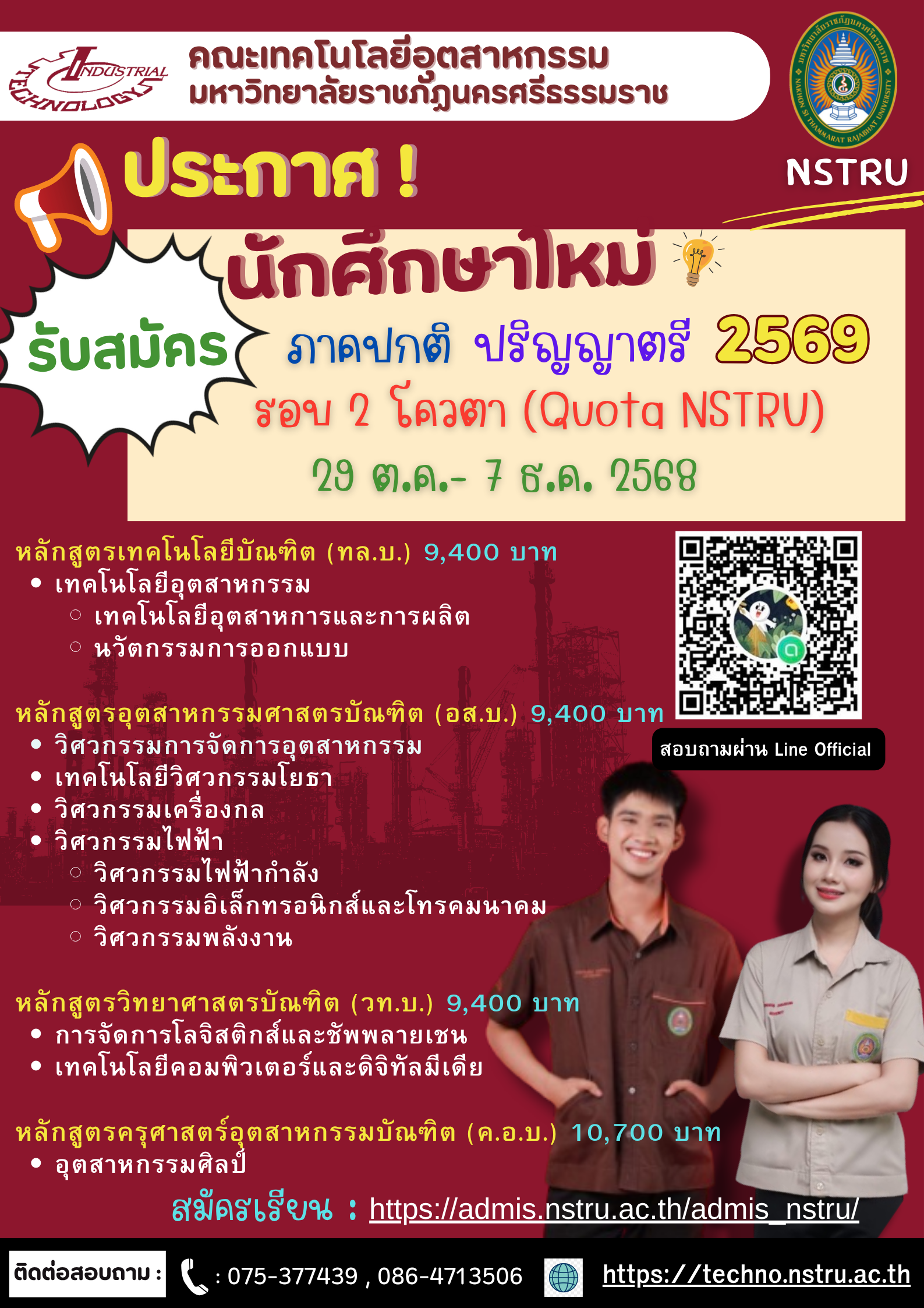 เปิดสมัครนักศึกษา ปริญญาตรี ภาคปกติ ม.ราชภัฏนครศรีธรรมราช ปีการศึกษา 2569 โควตา รอบที่ 2 วันที่ 29 ต.ค. - 7 ธ.ค. 2568