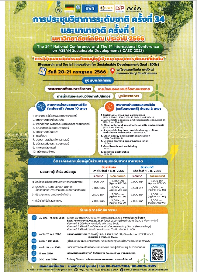 ขอเชิญเข้าร่วมประชุมและนำเสนอผลงานทางวิชาการการประชุมวิชาการระดับชาติ ครั้งที่ 34 และนานชาติ ครั้งที่ 1 มหาวิทยาลัยทักษิณ ประจำปี 2566