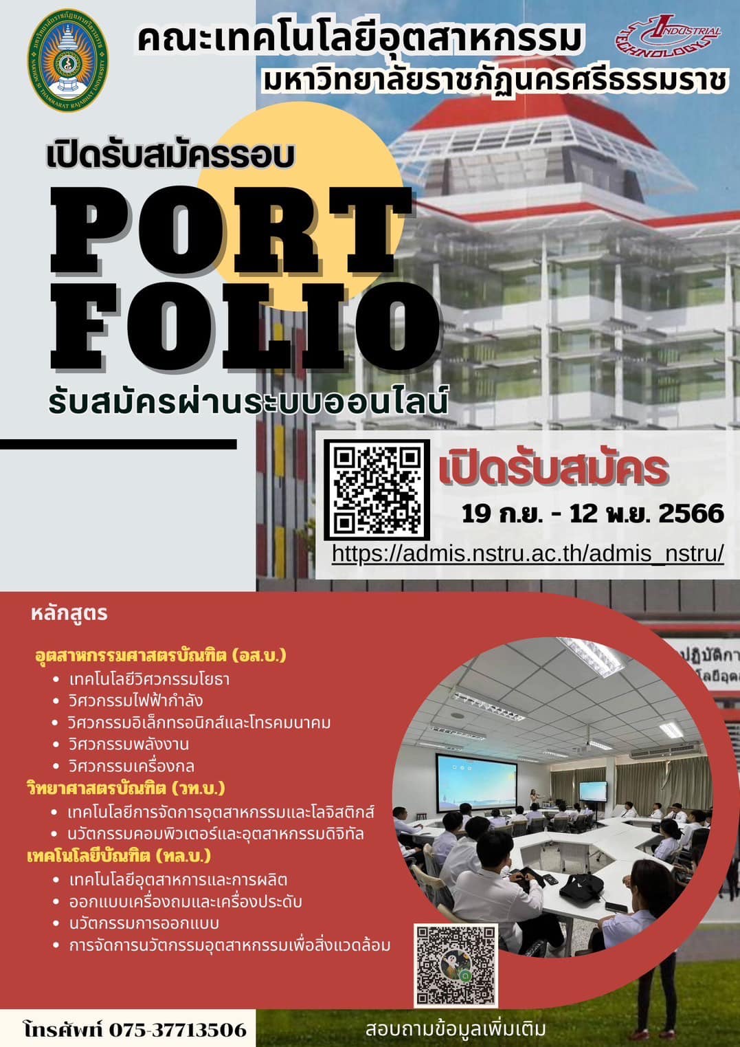 คณะเทคโนโลยีอุตสาหกรรม-ม.ราชภัฏนครศรีธรรมราช เปิดรับสมัครนักศึกษาใหม่ ปีการศึกษา 2567 รอบที่ 2 Portfolio (แฟ้มสะสมผลงาน) วันที่ 19 ก.ย. - 12 พ.ย. 2566 สมัครได้ที่ https://admis.nstru.ac.th