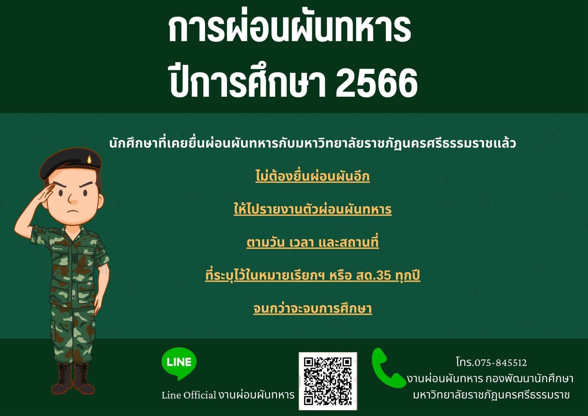 นักศึกษาที่เกิดปี พ.ศ. 2546 และยังไม่เคยยื่นผ่อนผันทหารกับทางมหาวิทยาลัย ให้รีบติดต่อเจ้าหน้าที่เป็นรายกรณีโดยแอดไลน์ งานผ่อนผันทหาร