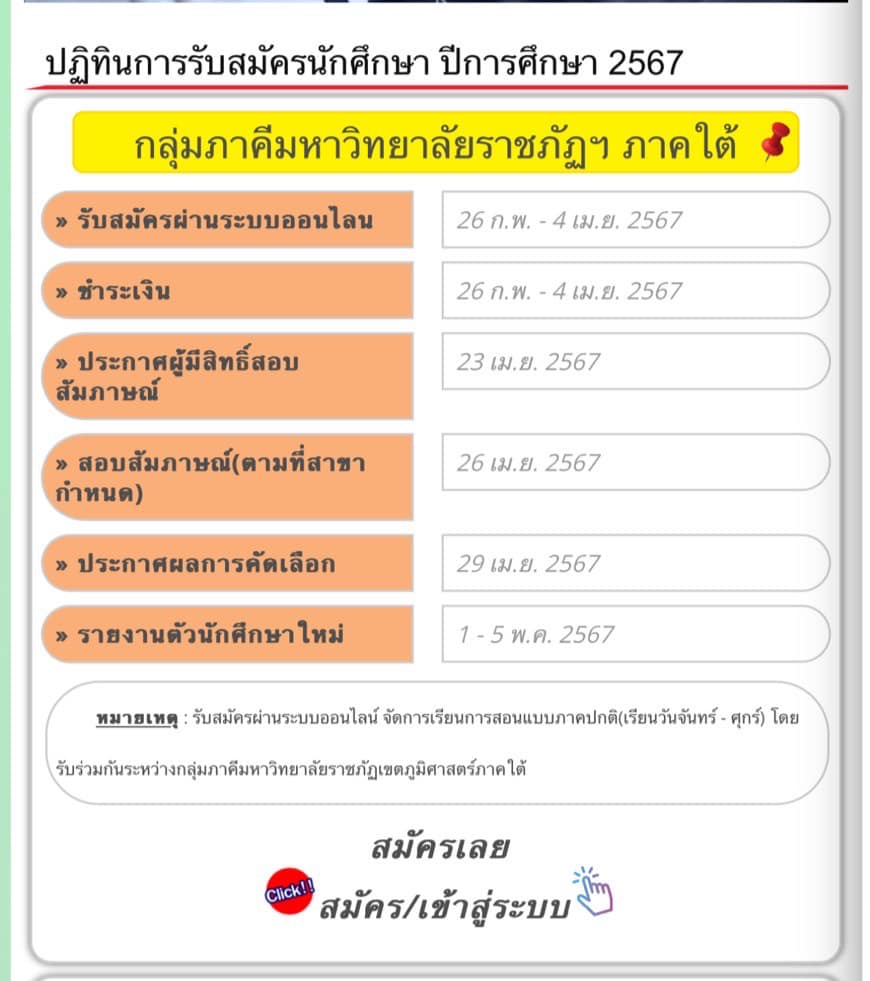 เปิดรับสมัครนักศึกษา รอบที่ 5 ประจำปีการศึกษา 2567 กลุ่มภาคีเครือข่ายราชภัฏภาคใต้ ตั้งแต่ 26 ก.พ. - 4 เม.ย. 2567