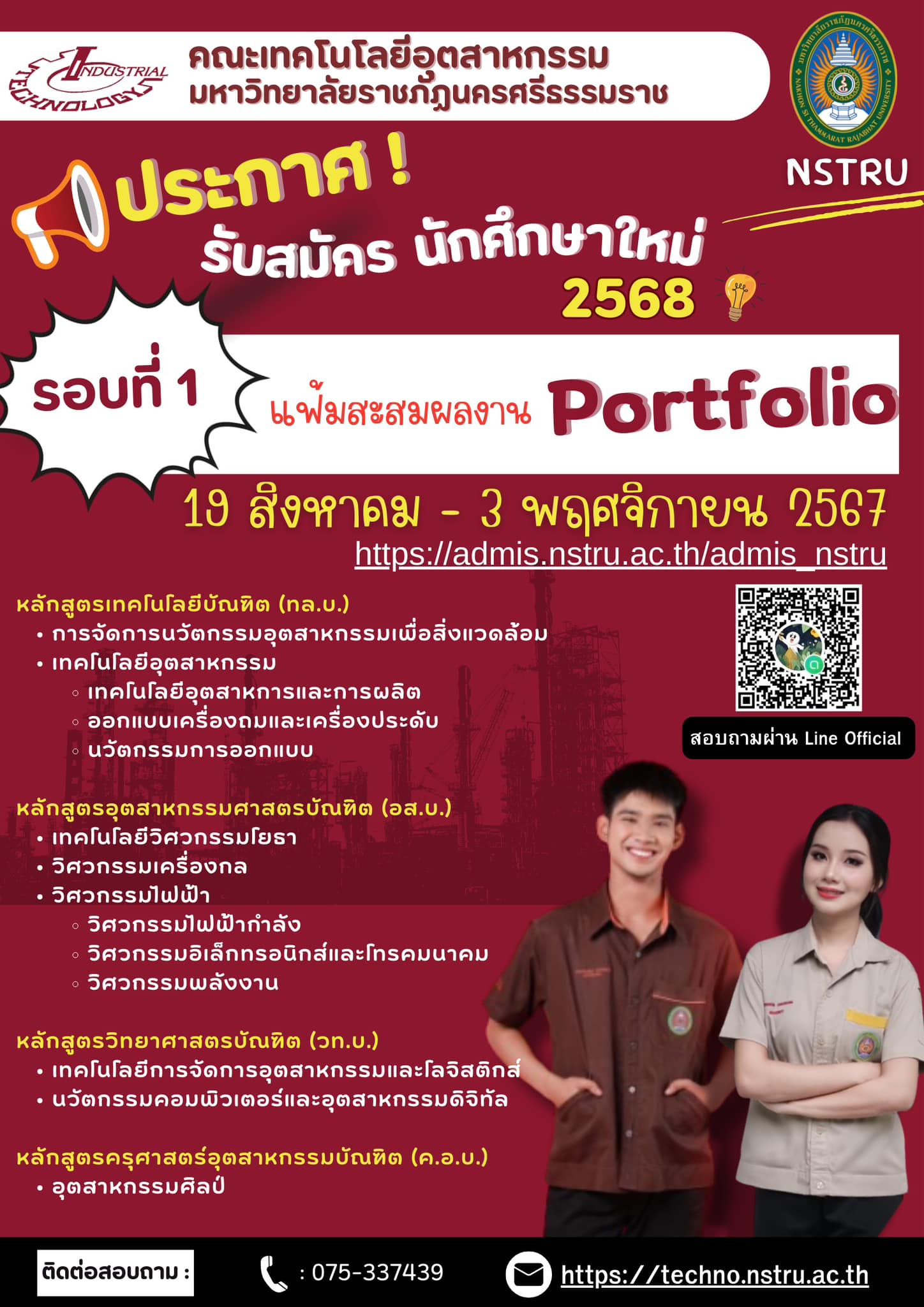 19 ส.ค. - 3 พ.ย. 2567 เปิดสมัครนักศึกษาปริญญาตรี ภาคปกติ ม.ราชภัฏนครศรีธรรมราช ปีการศึกษา 2568 รอบที่ 1 Portfolio แฟ้มสะสมผลงาน